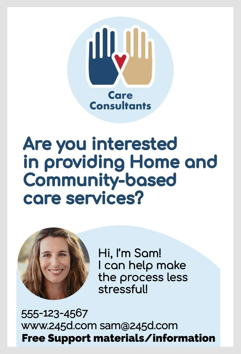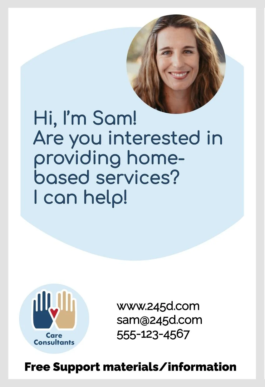 Our client is hoping to start their consulting business in the next year and in order to protect their privacy we created the moniker “Care Consultants” for their business and “Sam” for them.