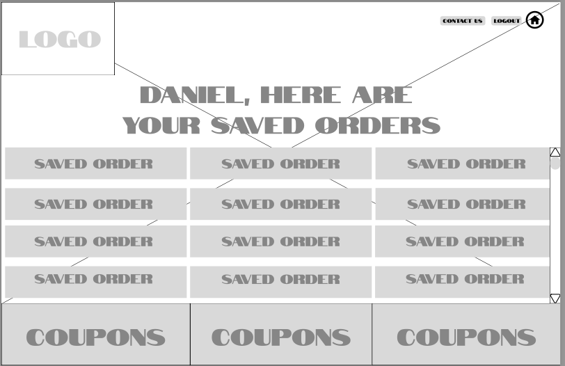 Based on the research findings, I created a website prototype. I began by sketching pages with pen and paper to organize a specific task flow. After a clear idea and path of that task flow was decided on I then created wireframes of those sketches in figma and eventually ended on a functional prototype that presented solutions for some of the pain points discovered in the research. It offered the users a more personalized experience as well as a streamlined way from the homepage to access their saved orders. I chose to present a specific style of restaurant to give my participants a more inviting, comfortable and familiar setting while testing.